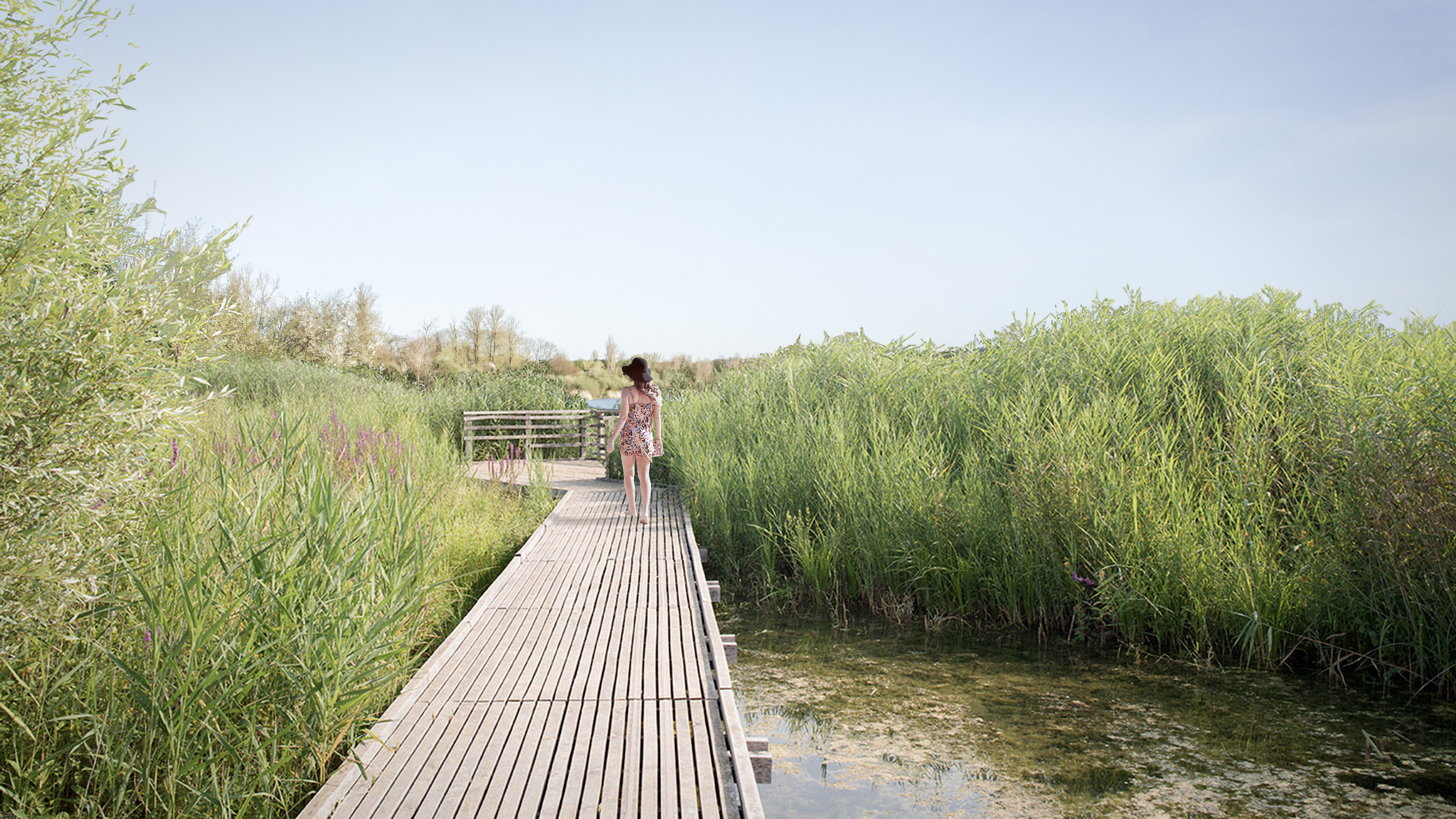 Краса місця і природні матеріали. Характер існуючого ландшафту і різноманіття флори й фауни є важливими елементами, які зберігаються і підкреслюються. Додані дерев'яні містки слугують орнітологічними пунктами для спостереження за крилатими мешканцями озера, а дерев'яні тераси забезпечують зручними виходами до води. Основні матеріали - використовуються лише природні матеріали – камінь, дерево, рослини.